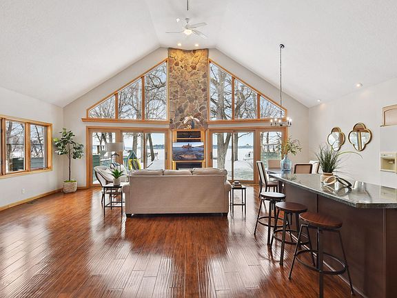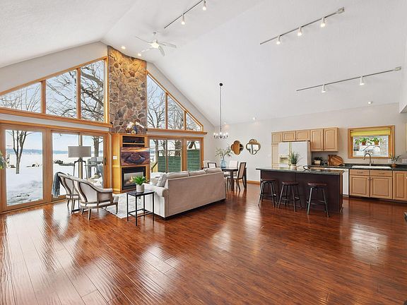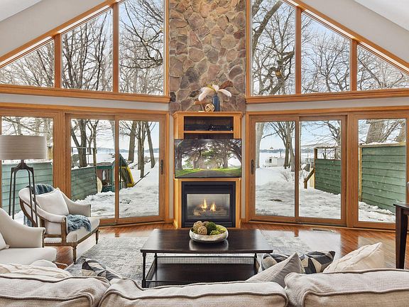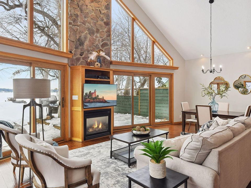 Welcome to lake life at its finest! This home on Lake Minnetonka sits directly on a 40-ft sandy beach with west facing lakeshore in Cook's Bay. Enjoy the outdoors from your expansive 2 tiered deck, soak up the sun from your dock, and boat around the bay until sunset. Walking into the home you see amazing views of the lake through the expansive windows on the lake side of the home. The vaulted ceilings in the living room, kitchen, and dining room take open concepts living to the next level. On the main floor you have two bedrooms, a full bath, and laundry. From the upper level owner’s suite you can enjoy an elevated view of the lake out the expansive windows to the lake. The owner's suite offers a spacious room with a reading nook looking out to the lake. In the owner’s bath you will find a jetted tub, shower, and walk in closet. This home features plenty of storage and extra space with the oversized two car heated garage with storage above. Don’t miss this opportunity!