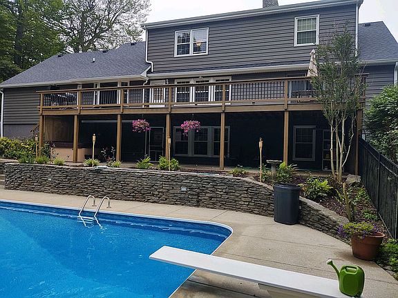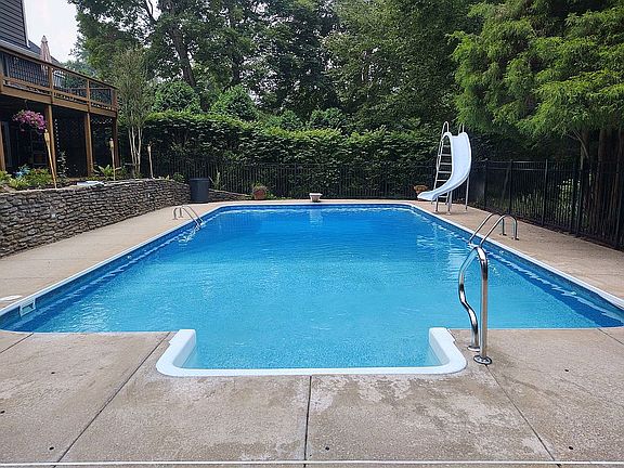 Staycation home in need of a new owner! One of a kind property, just a short walk to Mt. Saint Francis forest and walking trails. Located on 1.685 ac, on quiet cul-de-sac in desirable neighborhood in the Floyd Central school system (Floyds Knobs Elementary, Highland Hills Middle, Floyd Central High). Enjoy your summers in the 20' x 40' over-sized inground pool with slide and diving board, sipping a cold beverage in the gazebo, by the koi pond with water feature trickling down and surrounded by lush vegetation. In the winter, soak in the hot tub, watching the snow fall, while being under cover of the deck above. The home has low-maintenance vinyl siding, a 2 car attached side-entry garage with attic above, is on a private sewer system, heat pump and propane, with option to convert to natural gas. The finished walk-out basement has a large utility/laundry room, fireplace, and 1/2 bath. Master suite is on the main floor, with 2 bedrooms and a full bath upstairs and an additional bedroom in the lower level. The hot tub and pool table stay at no extra charge and no added value. Most furniture will be available at additional price if buyer interested. Seller is aware that kitchen, baths, and some flooring may need some updating by a new owner. No owner financing. Home sold as-is.