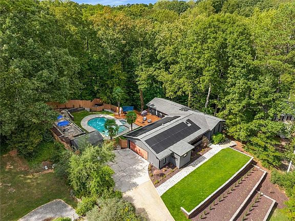 If one-of-a-kind design, energy resilient, and a home made for entertaining are on your list, you’ve just met your match. Set atop a lush, landscaped lot surrounded by trees, this modern ranch has undergone a complete transformation, inside and out. From the energy-resilient geothermal + solar + Tesla Powerwalls for low bills and whole-home backup, to the kitchen worthy of its own magazine spread, to the spa-style saltwater pool, every detail has been designed with luxury and functionality in mind. The main level features a white oak kitchen with custom made butcher block counters, Italian appliances, a six-burner stove, dual ovens, and wine cooler. Just around the corner, a secondary prep kitchen and 400-bottle wine cellar mean you’re ready to host. The primary suite addition is a retreat all its own, with heated tile floors, an MTI air-jet soaking tub, Grohe fixtures, fog-free mirrors, and custom built-ins that make every morning feel like a spa day. Throughout the home, you’ll find quality updates like hardwood floors, solid wood interior doors, and energy-efficient windows. Downstairs, you’ll find a fully finished lower level with a stylish bar, Dolby Atmos theatre, and space that easily flexes for guests or a home office. The exterior is showshopping with new landscaping and resurfaced retaining walls wrapped in Corten steel with soft recessed lighting. Multiple outside spaces really are an entertainer's dream - a beautifully resurfaced pool with a new salt cell system and upgraded Aqualink automation, a serene lower deck tucked in the trees, complete with a gas line, and a terraced, sun-soaked lounging area. Shed is wired with electricity and lighting for convenient storage. All of this is tucked away in the perfect location in Roswell: think farmers markets, live music on Canton Street, and cozy coffee shops tucked between boutiques and locally owned restaurants. On weekends, stroll the Roswell Mill ruins, kayak the Chattahoochee River, and enjoy all Roswell has to offer.