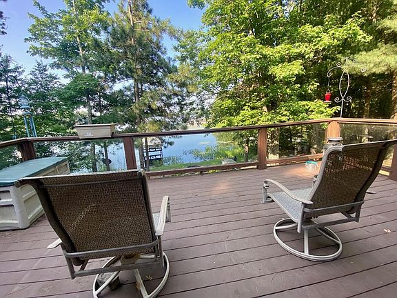 Located on Lake George this 3bedroom 3 full bath house with attached 2 car garage is ready for a new family to enjoy. The kitchen has oak cabinets, newer stainless steel appliances breakfast island and is open to the dining room & living room. The lakeside deck has steps to the lake and a patio door to the living room. The master bedroom suite has a full bath with, walk in closet and a beautiful lake view. The second bedroom has a shared bathroom with walk in tub and a smaller walk-in closet. There is main floor laundry with the seasonal sunroom adjacent. The walk out lower level has a bedroom, large family room with a pellet stove, large windows to enjoy the lake views, a full bathroom, & a work bench area in the utility room. This property includes a lakeside shed, shore station, fenced in garden area, whole house generator, all appliances, black topped driveway and a large storage room above the garage that would make a perfect art studio.