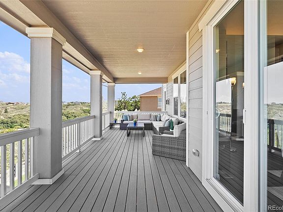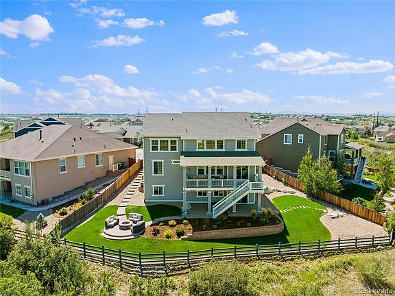 WELCOME HOME! Stunning View Home nestled on one of the best private cul-de-sac lots in the Terrain Community! Enjoy amazing sunrise views from the oversized covered balcony or relax by the built-in gas firepit overlooking nature & the valley. This home has everything you can dream up! Large open floorplan with gourmet kitchen which includes granite counters, SS appliances, double oven, upgraded cooktop, butler's pantry area and walk-in pantry which leads to the formal dining area with tray ceiling (currently set up as an office). You can entertain your guests at the large island/breakfast bar which opens up to the great room where you can enjoy a cozy fire by the picture-perfect viewing windows. There is a private main floor bedroom with walk-in closet along with a full bathroom off the mudroom area. Leading up from the dramatic staircase you will find a large loft with great views and two secondary bedrooms with a shared Jack-and-Jill bathroom (each with a separate sink, vanity and dressing area). Enjoy additional amazing views from the large primary suite with tray ceiling and relax in the spa-like bathroom. Adjacent to the 5-piece bathroom, you will find a huge walk-in closet that connects to your dream laundry room with plenty of storage and a sink. As you head down to the basement, you will find the builder-finished walk-out basement with 9ft ceilings, bedroom with walk-in closet, full bathroom, large recreation area, wet bar w/ sink, granite countertops and a mini refrigerator. This home has newer carpet (stairs & upper level installed last week) and beautiful hand scraped hardwood flooring throughout! Terrain amenities include 2 community pools, recreation center, tennis court, parks, trails and even a dog park! Short drive to Downtown Castle Rock, I25 and approximately 30 minutes to DTC.