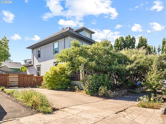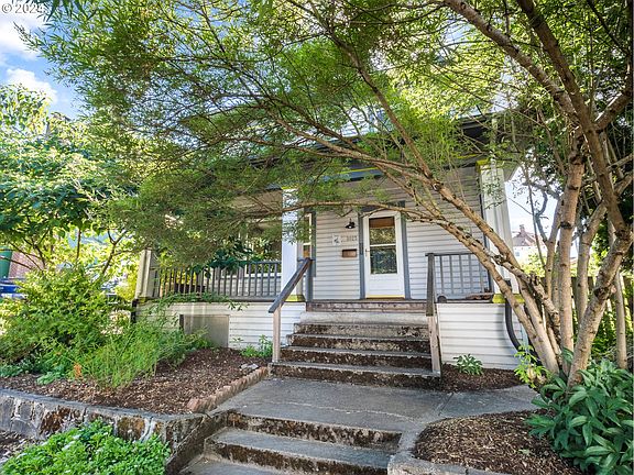 Welcome to this enchanting 3-bedroom Old Portland 4-Square style home, complete with a versatile nursery/office, gracefully situated on an oversized lot adorned with native landscaping. With a wonderful blend of historical charm, thoughtful upgrades, and modern conveniences, this residence is easy to love. As you step into the open foyer, you'll be greeted by dramatic high ceilings and a stunning open bannister stairway that ascends to a spacious second-story landing. The formal living and dining rooms evoke grander eras, featuring large south-facing windows that bathe the rooms in dappled light, creating a warm and inviting atmosphere. Picture yourself hosting elegant dinner parties or enjoying tranquil evenings in these beautifully illuminated spaces. The large kitchen, with its lofty ceilings, is a culinary haven. It offers abundant counter space and storage, ensuring room for all your gastronomic desires. The kitchen seamlessly connects to an open mudroom with built-ins, providing a lovely pantry area. From the mudroom, elegant French doors open up to the expansive yard, offering an easy transition between indoor and outdoor living. The main floor also features a handsomely updated bathroom and an efficient laundry room that makes daily chores a breeze. Upstairs, the home continues to impress with a spacious primary bedroom that includes large closets, providing ample storage space. The luxurious bathroom on this floor feels like a true sanctuary, featuring tile work and modern amenities that promise relaxation and indulgence. A second generously-sized bedroom offers additional space for family or guests. The nursery/private office can easily be converted into a third bedroom, catering to your specific needs, whether you require a quiet workspace or an additional sleeping area. This home is truly a gem, and not one to miss, offering a distinctive living experience in the Brooklyn neighborhood. Assumable VA loan with low rate, [Home Energy Score = 2. HES Report at https://rpt.greenbuildingregistry.com/hes/OR10048972]