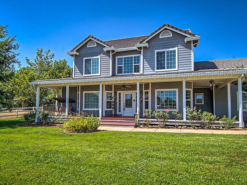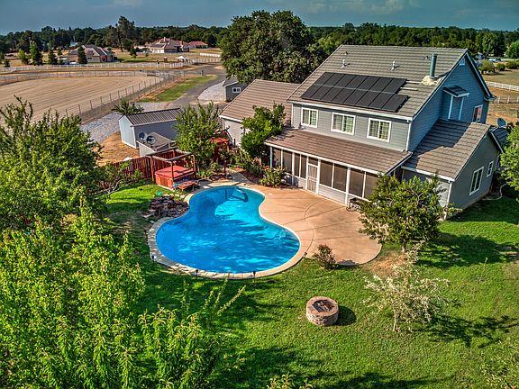 Beautiful 5 bed 3.5 bath Ranch Property on nearly 10 acres! Main level half bath and master suite with remaining 4 bed/2 bath upstairs. Beautiful oversized front porch and large 3,750 sqft open floor plan includes a grand entryway, formal dining room, breakfast nook, walk in laundry room and plenty of storage space! Gorgeous property backs up to Cottonwood Creek and offers tons of privacy. Property includes owned solar, spacious gunite pool, outdoor kitchen, detached office, barn and cross fencing for animals. Automatic sprinkler system for pastures currently being installed. Additional 8.6 acres lot with huge riding arena is also listed for sale next door. Contact your Real Estate Agent for more details. This is a must see!