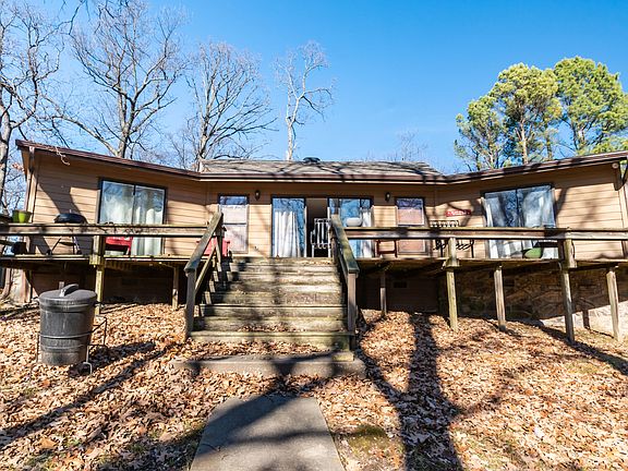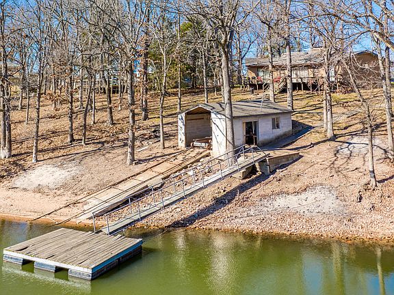 Cozy Cabin on Monkey Island, 101' shoreline, Boat house with rail system, flat swim dock, large yard full of mature trees. Charming development in secluded area. Just a few short miles to the Shangri-la Golf course, pro shop and Summit restaurant. Home features open living floor plan, 2 bedroom suites, natural rock wood burning fireplace, sliding glass doors open onto the wood deck from the living area. You can also enjoy deck access from each bedroom suites. Total Electric, heat pump, new roof, rail system is set for pontoon. Flat swim dock. Deck offers easterly views, perfect view for watching the sunrise from the deck each morning! This lake home is priced to include all furniture and will be sold as is.