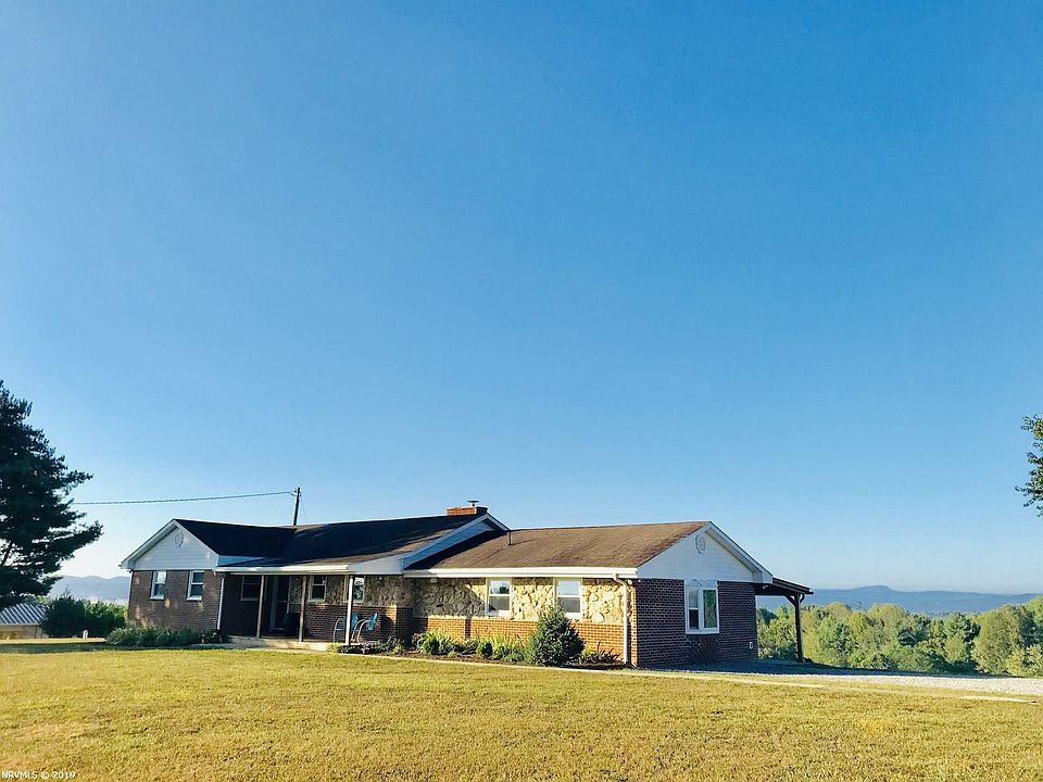 Welcome to the country! Amazing mountain views from this 2200 sq ft brick country home. Home has a newly remodeled kitchen w/ a farmhouse sink and butcher-block countertops and original hardwood floors throughout most of the main level! Cozy up in the spacious living room by the fireplace with views of the mountains from the picture window overlooking the backyard and fields. Laundry area is conveniently located on the main level. Partially finished basement w/ loads of room for storage and recreation. Spend your evenings on the covered back patio enjoying the incredible views & sunsets! This 6+ acre property consists of 3 parcels with more road frontage & fields. This property is perfect for a hobby farm with several outbuildings. A 36x30 detached 2-bay garage & 4-bay 44x14 pole barn includes an attached chicken coop. An additional goat barn/chicken coop is located right by the established garden space. Fruit trees and a grape vine complete this property! Don't miss out!