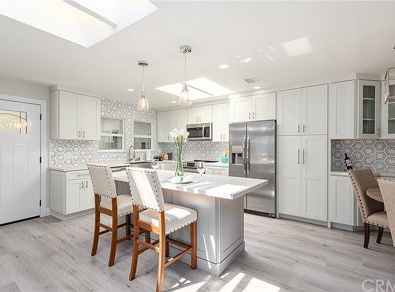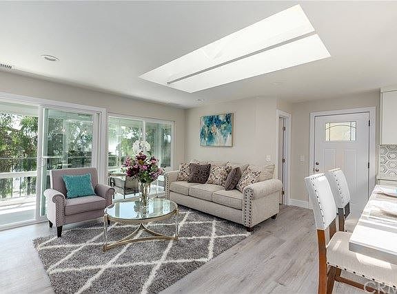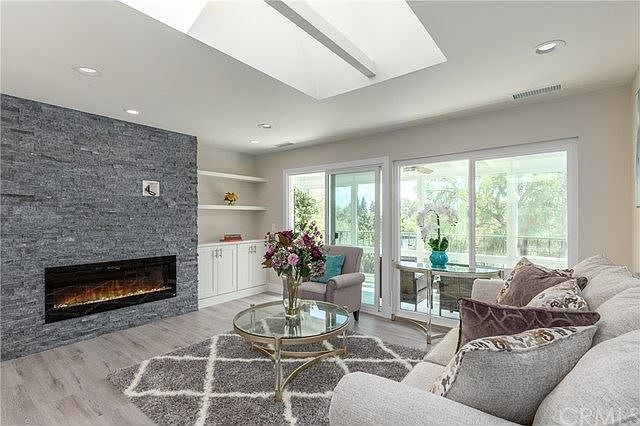 BEAUTIFUL NEW RENOVATION WITH A VIEW: This home is located in one of the most popular and sought-after 55+ communities in South Orange County, CA and has been completely remodeled. NO EXPENSE WAS SPARED for this CONDO renovation and Popular "Casa Del Mar" floor plan. This property has everything you are looking for in Laguna Woods Village to include 1. No one living above you. 2. Private in-home Laundry 3. End unit covered Parking. 4. No steps or stairs. 5. Private and quiet. 6. Central air conditioning and heat. 7. Highly upgraded renovation. 8. Behind Gate #7 in Phase 3, the most popular part of the community. This unit has 2 sky lights that flood the home with plenty of natural light. Brand new everything, including waterproof flooring throughout with high-end porcelain tile in both bathrooms. High-end Quartz counters throughout, stainless steel appliances (still under warranty), and custom cabinetry in both the kitchen and bathrooms. Custom built-in entertainment center includes an electric fireplace, pre-wired for a flat screen TV to mount above, and bookshelves with architectural cabinetry to frame-out a beautiful focal point in the living room. The master bedroom includes a walk-in closet, a master on-suite bathroom with a large executive shower. This home includes new skylights, new solar tubes and countless recessed lights. There is a private enclosed balcony with porcelain tiling overlooking the tennis club as well as an outdoor patio area as well.