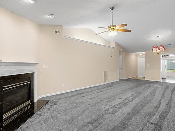 Beautiful Condo in lovely Greystone Condominiums just minutes to interstate and Burlington features vaulted ceilings, huge living room/dining room combo with brass chandelier, ceiling fan, gas log fireplace, and a display shelf with accent lighting. The kitchen has a double window in the breakfast area, lots of cabinets, built-in electric range and microwave, refrigerator, dishwaher, disposal and viny floor. The hallway leads to all bedrooms, laundry closet with washer and dryer, and to garage access door. The spacious Primary bedroom has a huge closet and bath with a walk in shower with shower seat.The hall bath is equipped with a jetted, walk-in tub and linen closet. The other bedrooms have double size closets; all bedrooms have double windows and carpeting. A patio door in the living room leads to the concrete patio with a beautiful trellised custom built swing, outside storage room and a Generac generator. Garage has custom cabinets and pulldown stairs to attic. HOA dues $150/mo.