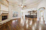 Large islandMain-level primary suiteStone fireplaceOverlooking the fenced backyardOpen floor planOpen kitchenVersatile bonus room