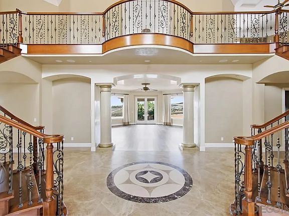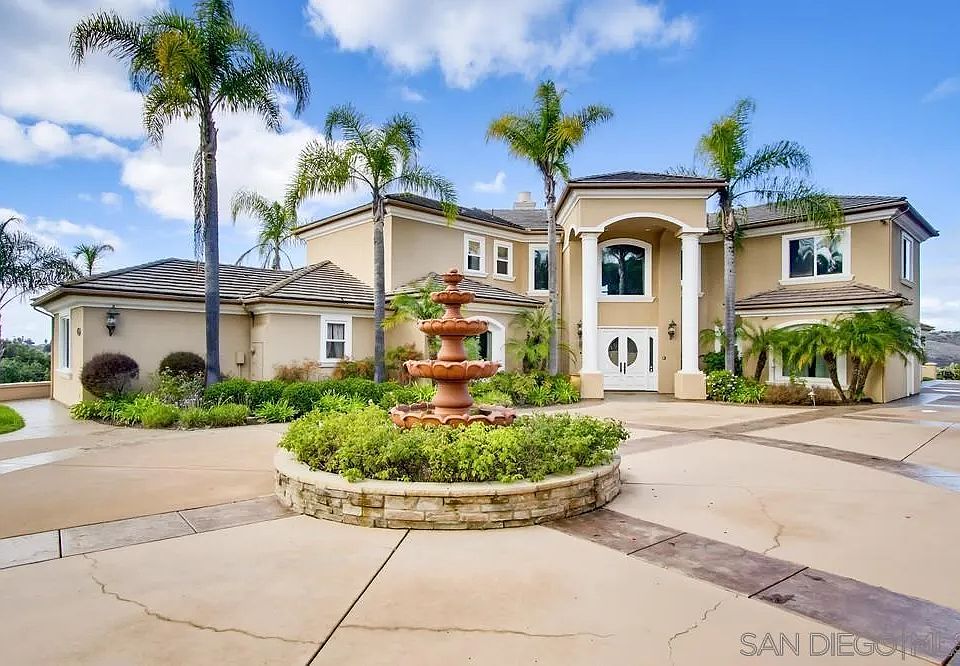 SHORT SALE OPPORTUNITY! Welcome to Château Belle Vue, where luxury, privacy, and panoramic views come together in this stunning Mediterranean estate nestled in the hills of Bonsall. Set on 2.44 acres within a gated community, this custom-built home is designed to impress from the moment you arrive. A dramatic double staircase entry with dual art niches ushers you into a grand living room framed by breathtaking picture windows that capture the surrounding beauty. Upstairs, you’ll enjoy the expansive primary suite, complete with a generous bathroom, jacuzzi tub, and a true sense of retreat. This level also features a dedicated bar area and a separate loft—perfect for hosting, relaxing, creating additional entertaining zones, or even converting into a fifth bedroom. Downstairs, three additional bedrooms each include en-suite baths and walk-in closets, making the home ideal for multi-generational living or guest privacy. The chef’s kitchen offers an exceptional space to cook and gather, boasting premium appliances, an oversized pantry, and dual islands. Formal and casual dining spaces, along with a temperature-controlled wine closet, elevate the home’s entertaining appeal. A large first-floor laundry room provides excellent storage and direct access to the outdoor patio. Step outside to a backyard designed for relaxation and gatherings, complete with a built-in BBQ and plumbing ready for a portable setup. With endless potential to create your own outdoor oasis, this property beautifully blends elegance, comfort, and elevated Bonsall living.
