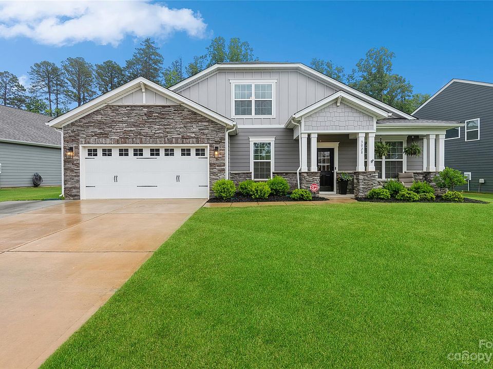 WELCOME HOME to 3028 Eagle Ridge lane... Desirable Heritage Community. This Beautiful Crafted 1.5 Story Home is situated on a Spacious Private Wooded Fenced in Backyard. The Home offers a Rocking Chair front porch, Open floor plan w/ architectural details throughout, upgraded lighting fixtures and faucets. Gourmet Kitchen w/ SS Appliances, Farm sink, Oversized Island, Breakfast and Dining area, Study/Office w/built in desk w/ shiplap wall, Main Level Primary Bedroom w/ a luxurious Primary bath, 2 additional oversized secondary bedrooms with a full bath. Laundry on the main level. Upstairs offers a Bonus room, along with another Bedroom and Full Bath. Stunning outdoor living space, 18x20 Screened Porch w/ Cathedral Vaulted ceiling, extra large concrete pad for grilling or storage. Attached 2 car garage w/ extended driveway 3 wide for additional parking. Easy access to shopping, interstates, restaurants, parks, greenways, medical, Uptown, and South Charlotte. Home is Move in Ready!