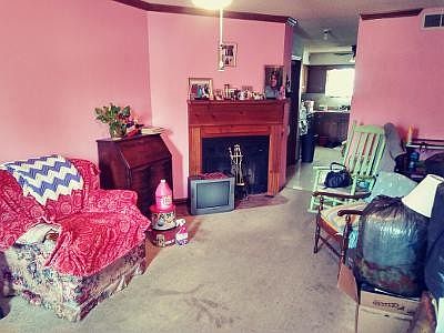 This "AS-IS" house has a fireplace, driveway, and a big backyard with a deck.