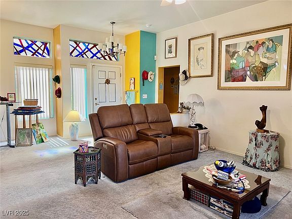 Interior painting and new flooring being installed!Unique Tahoe model in FAB Sun City Summerlin! Artist/Collector's personal residence. It is warm & inviting w/color on the walls! 2 Bedrooms plus an office and 2 car garage. Open kitchen with nook. Both bathrooms are ADA compliant showers. Living room is separated from nook area by a full wall, something different in a Tahoe model, easily removed or cut down. Large backyard. Stained glass windows do not convey with the property. Location is mid point in the community with easy access to all community centers, golf courses and shopping. Buyer will have access to all community facilities including 4 community centers, 3 golf courses, pools, spas, tennis & pickleball courts, mini golf, bocce ball, softball and over 70 Clubs!