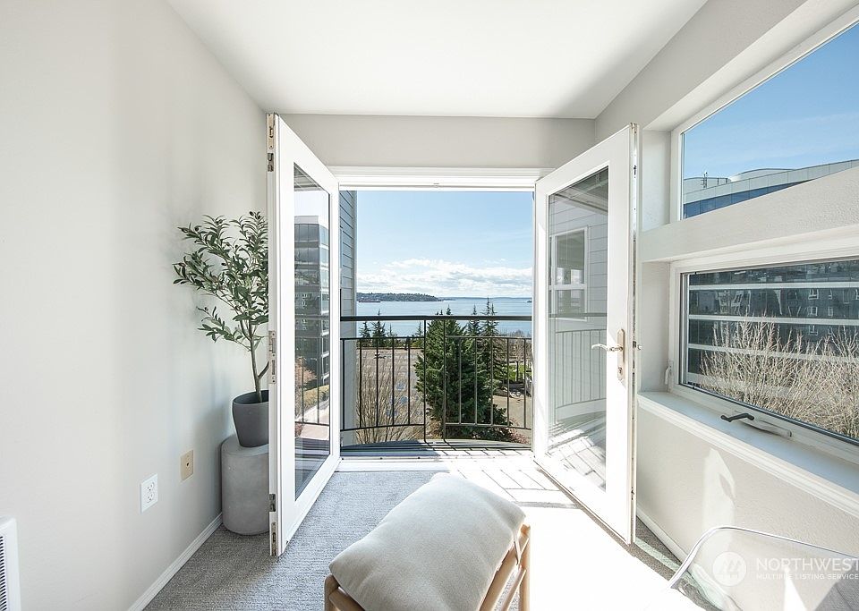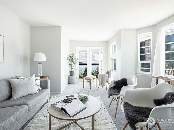 Enjoy water & mountain views from the living room, dining room & kitchen! Watch the ferries & marvel at the sunsets from juliette balcony. Bright & airy, top floor, corner unit features large living room with gas fireplace, newer carpet & fresh paint throughout. The remodeled kitchen includes a breakfast bar & spacious dining area - ideal for hosting friends. Large bedroom easily fits king bed & includes walk-in closet. Across from Olympic Sculpture Park & seconds to Queen Anne/Belltown! Building amenities include rooftop deck, gym, sauna & entertainment room. In unit washer/dryer. Assigned parking space included, pet friendly & no rental cap! Well run HOA with new elevators and many updates!