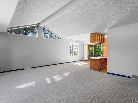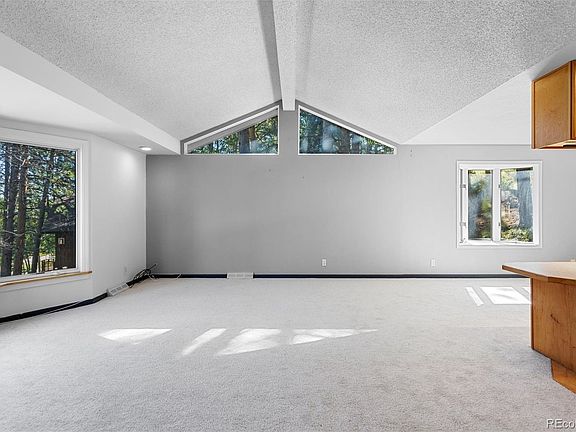 All of Evergreen’s amenities are right out the door from this 4-bedroom, 3-bathroom El Pinal home. Nestled on a wooded lot with a small creek in front, this 2,114 square foot home has a welcoming exterior with natural stonework, a paved driveway, an attached 2-car garage and additional storage shed. An art deco glass front door invites you into the split-entry home with a functional layout. Bay windows and vaulted ceilings in the upper living area allow plenty of natural light. The kitchen features a greenhouse window, wood flooring and cabinets, an under-sink water filtration system, and walks out to a composite deck and recently-updated flagstone patio. Three bedrooms, including the primary suite, are situated on the upper level, as well as a full bathroom. The primary suite features two closets, a bathroom that was updated in 2019, and walks out to a greenhouse/sunroom. The cozy lower level living space includes a natural stone wall and new wood-burning stove insert. This room could be utilized as a rec room, play room, office, workout room or more. An additional bedroom and full bathroom are located on the lower level, as well as a spacious laundry/utility room. Public water and sewer through Evergreen Metro District. New sewer line from main line was replaced in 2024. Located .5 miles from Stagecoach Park, 1 mile from Safeway, 2.5 miles from Downtown Evergreen, and 1.3 miles from Elk Meadow Open Space Park.