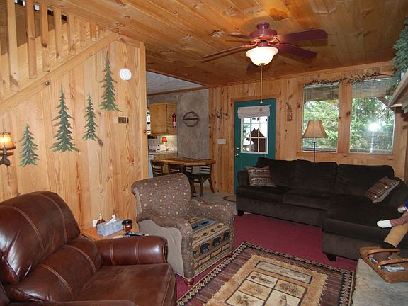 his super cute 1 BR, 1.5 BA cabin is a definite charmer. Great floor plan with a fully equipped kitchen and cozy living area with a wood burning fireplace. There is full bath on this main level as well as a full size laundry room. Upstairs in the loft you will find a spacious sleeping area that currently offers three beds. It would be easy to build a partition if you want to create private sleeping areas in the loft. Outside on the deck you will find a cozy alcove that has been created with outdoor relaxing and entertaining with a firepot with its own chimney. Everything about this cabin is cozy, quaint and well maintained. This cabin shares utility water usage with the community as well as shares septic with a neighboring cabin but information is on file to clarify this information. Sellers have used this property as their own private getaway so it has not been on overnight rental within the past three years. Located directly across from Dunns Market so easy year round access with no steep roads. A definite MUST SEE at this incredible price!