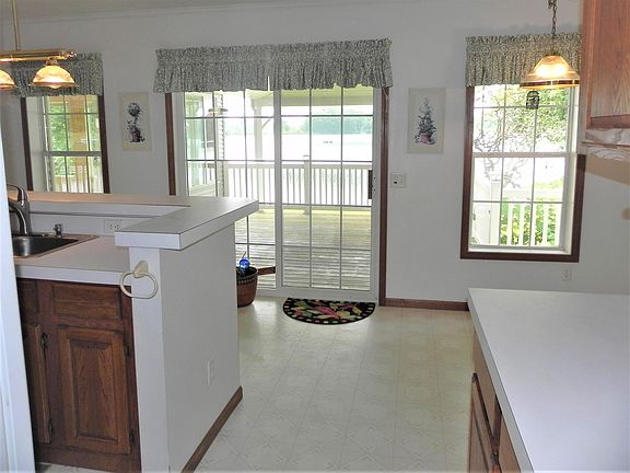 ?Beautiful ranch home on Eberhard Lake-a smaller, all sports lake. 2 bedrooms, 2 full baths, & beautiful, spacious sunroom with amazing views of the lake from most rooms. Such a serene setting with stunning lake views & gentle slope to the water. Some features include large master suite with walk in shower, walk-in closet, & slider to deck on the lake side. Kitchen with dining area, large walk in pantry, & slider door to the covered deck, also overlooking the lake. Spacious, open living room with vaulted ceiling & wood-burning fireplace. Office/library is attached to the main entry/mudroom. There is a crawl space with a lot of storage space, 2 car attached heated garage with sink, workbench, & floor drain. Dock is included. Decor pond, peach trees, large garden area. Sprinkling syst