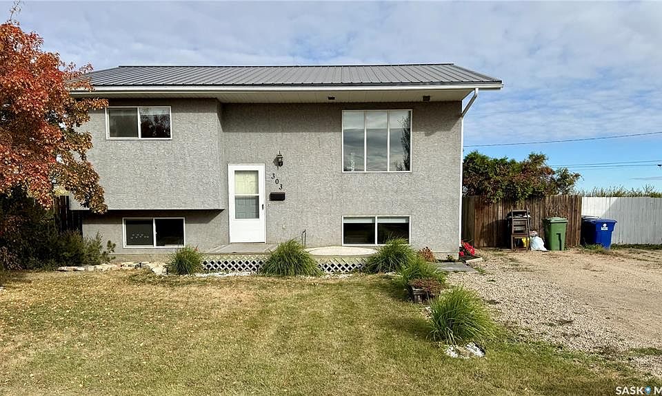 Welcome to 303 4th Street in Dundurn, Saskatchewan. This spacious 984 sq ft bi-level home is located just 30 minutes south of Saskatoon and only five minutes from Blackstrap Provincial Park. Perfect for families, first-time buyers, or anyone looking for more space, this 5-bedroom, 2-bathroom property offers excellent value with room to add instant equity. Set on a 66’ x 126’ lot, the yard features MATURE TREES, STUCCO SIDING, a METAL ROOF on the house (garage has asphalt shingles), and an OVERSIZED 28’ x 24’ fully insulated double detached garage. Inside, the bright, functional layout includes a welcoming living room with large SOUTH FACING windows, a kitchen with concrete countertops, white cabinetry, pantry, and stainless steel appliances. The adjacent dining nook opens to the back deck, creating an easy indoor-outdoor flow. Durable laminate flooring is found throughout the home for a clean, modern look. The main floor offers three bedrooms and a full 4-piece bathroom. The fully finished basement adds two more spacious bedrooms, a family room, a 3-piece bathroom, extra storage and laundry/utility space. Recent updates include a washer/dryer, laminate flooring, trim, bathroom fixtures, and the home is equipped with forced-air natural gas heating, an owned furnace, and a gas water heater. Appliances are included, making this home move-in ready. This Dundurn real estate listing backs onto open fields for peaceful prairie views while keeping you close to Saskatoon and Blackstrap Provincial Park. A rare opportunity to enjoy small-town living with modern convenience!