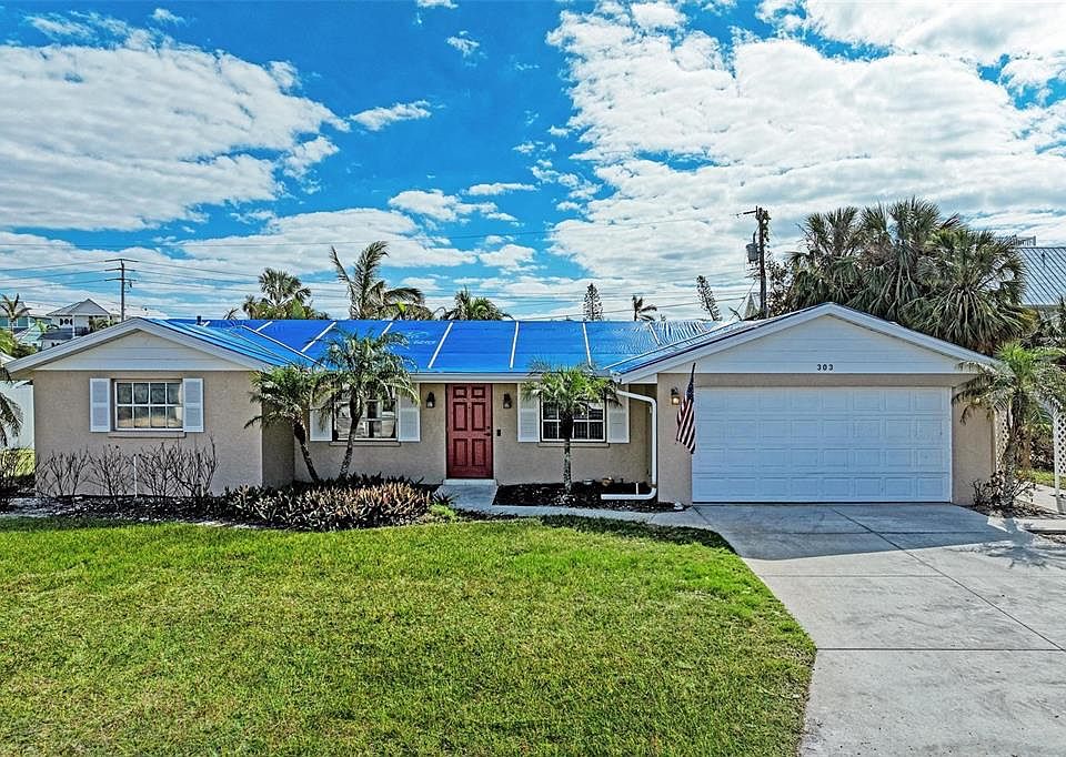 3 bedroom/2 bath home with office, centrally located and just over two blocks from the sought after Gulf Waters. Zoned R-2 to allow for Weekly Rentals, this would make a lovely full-time residence or short term rental. Situated on a roomy lot, this well loved family home has experienced damage from Hurricanes Helene and Milton. All furnishings, appliances and lower cabinets have been removed. AC is working. The drywall has been cut back and home has been remediated. The roof has been tarped as there are some missing shingles. An artesian well for irrigation purposes is located behind the master bedroom windows approximately halfway between the house and neighbor's fence. For those seeking the Island Life, this is an opportunity to rejuvenate the existing home or build anew.