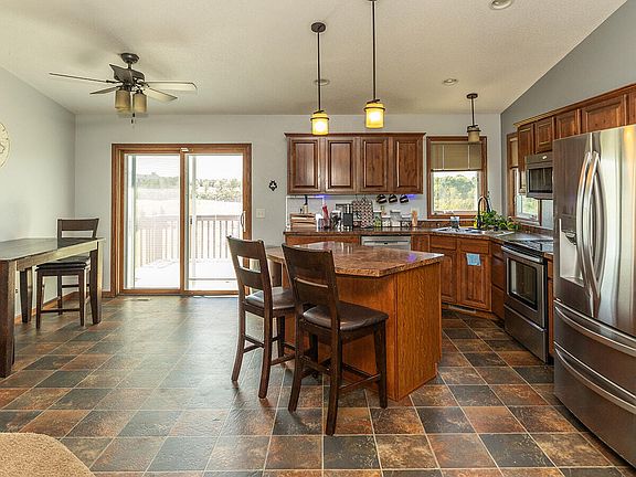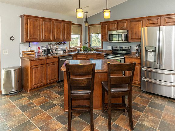 This Multi-level home is located on 1.62 acres in the NW Rural Bismarck development of Harvest Grove. The home features an open main floor with a spacious living room open to the kitchen with chestnut stained maple cabinets, upgraded stainless appliances and a center island. There is a deck off the dining area that overlooks the spacious yard surrounded by trees. The upper level has the primary bedroom with ensuite that offers dual sinks and walk in closet. There is another bedroom with walk in closet plus a full bath. The 3rd level has a spacious family room with wide plank LVP flooring plus a laundry room with cabinets and folding space. There is a 3/4 bath just completed. The lowest level has 2 more spacious bedrooms plus the utility room. There are 6 paneled solid doors throughout. There is a 3-stall finished, heated and insulated garage with hot and cold water and floor drain. There is a steel roof.