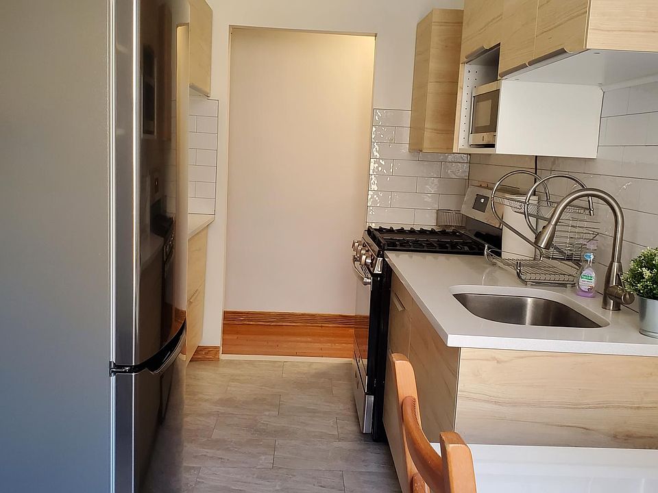 Newly renovated, new kitchen and bathroom, spacious, separate rooms, elevator, top floor. Minutes from public transportation and shopping. Water and heat are included. Renter is responsible for gas and electricity. Last month rent is due at signing. Non smoking allowed. Up to 3 persons permitted. Proof of income and Board approval is a must.