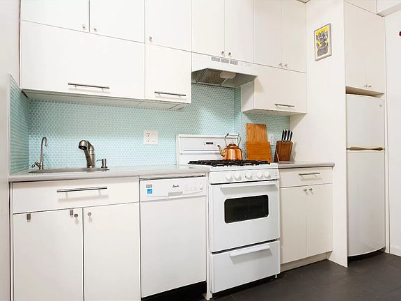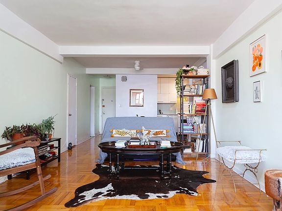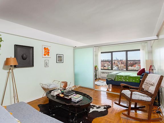 Move-In Ready! Modern Kitchen & Bath. This oversized bright & sunny studio apartment has room for it all, a separate sleeping area able to hold a king-size bed and a home office, a large living area, and even a dining area to host your next dinner party. The retractable partition from Sliding Door Company adds privacy to the sleeping area but still surrenders abundant natural light. The 3 closets are huge including 1 large walk-in, a separate dressing room and a well-thought-out place for everything due to the installed Elfa system throughout. The views from this 8th floor unit couldn't be better with panoramic Manhattan skyline views. The kitchen and bath are completely renovated with the kitchen having tasteful white cabinetry, penny tile backsplash, tons of storage and includes a dishwasher. The bathroom has been tiled in a neutral and has storage under the sink. The unit has hardwood floors throughout and through-the-wall air conditioning. 303 Beverly is a 24-hour doorman high-rise building with 2 new elevators, a live-in super, a bike room, a central laundry, indoor parking (waitlisted) and is cat friendly. A new video intercom system is now being installed. The Express F train is a block away along with the G and many express buses as well. Located just a short walk to nearby Prospect Park, and many commercial sectors of Windsor Terrace, Ditmas Park and Kensington offer a breadth of restaurants, bars, cafes and grocery stores. A must see!