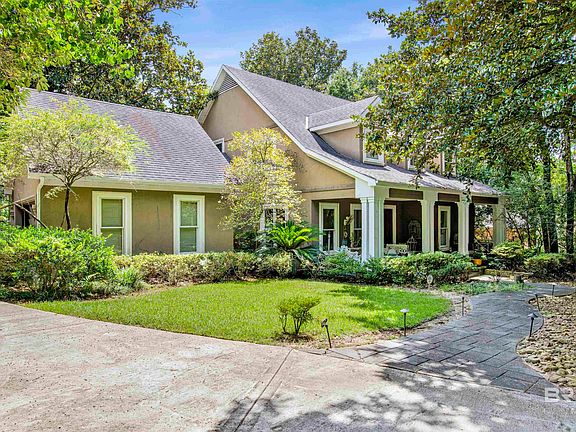 Lorna Huey designed Creole home in sought after Cameron Court neighborhood in Old Town Daphne is a hidden treasure & a true Southern gem! This spacious four bedroom, three & a half bath home on a wooded cul-de-sac street w/ bay access is perfectly situated within walking distance to area schools...Bayside Acadamy, Christ the King school, Daphne Elementary, restaurants, coffee shops, & medical facilities, w/ natural low-maintenance landscaping (featuring river rocks, an abundance of magnolia trees, bamboo, vibrant hydrangeas), irrigated yard with 10 station irrigation system & fully fenced. Porches are stamped concrete & have ceiling fans & a new deck out back! Step inside this spacious, inviting interior, boasting a separate large dining room/library with loads of bookshelves & butler's pantry with wet bar. The kitchen has a gas stovetop with beautiful custom stone hood & backsplash, granite, kitchen island, lots of storage & separate breakfast area & desk. An expansive living room, adorned with authentic Saltillo Tile & beautiful large gas fireplace trimmed with a bullnose mantle & surround. The laundry room is very large with mop sink and loads of storage for your convenience. The large primary bedroom is located on the main floor featuring engineered hardwood floors & charming gas fireplace. The primary bath has double vanities & oversized closets. Making our way upstairs, there is a chairlift for ease and convenience. At the top of the stairs is a large den area with built-ins & an office area with built in granite desk & bookshelves. Upstairs there are 3 additional bedrooms with XL closets & 2 full baths with charming nooks and details. The 2-car garage has built-in cabinets & shelves with loads of storage options & an attic pull-down w/ large storage area. This exquisite neighborhood has deeded bay access for homeowners for sunsets every day! An easement behind the home provides privacy and quiet home life. $10,000 CREDIT FOR INTERIOR UPGRADES! HOME SOLD AS IS