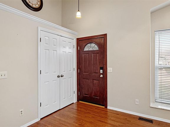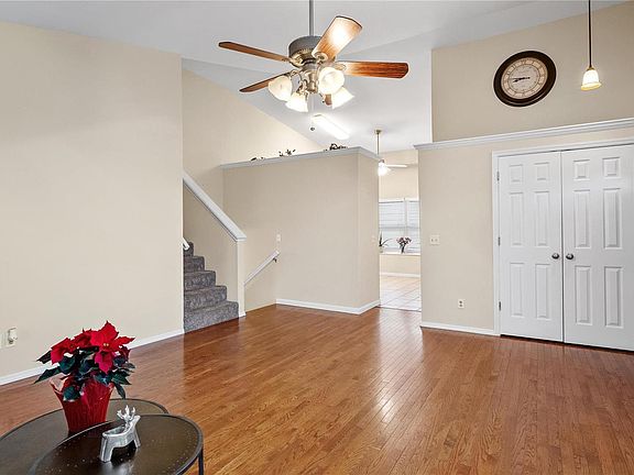 Turn-key ready. Step through the front door of this inviting, 3-bedroom home and you find yourself in a bright front room with a bay window, wood flooring and a soaring vaulted ceiling that stretches over to the adjoining kitchen. The kitchen features a tile backsplash, pantry, stainless steel appliances, ample counter space, and a planning desk. Step out the rear kitchen door into the large, flat, fenced backyard with a spacious stamped concrete patio with a retractable awning. Upstairs you will find 3 bedrooms with a full bath off the hallway. The corner master bedroom has a large walk-in closet and an ensuite bathroom with a shower. Downstairs there is a comfortable, carpeted den/rec room and a small, private office space with windows facing out to the rear yard, aa well as a separate storage room and the utility room. The home sits on a quiet cul-de-sac, ideal for neighborhood play, and is situated close to shopping areas, St. Charles Community College and Legacy Park.