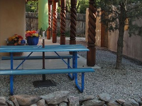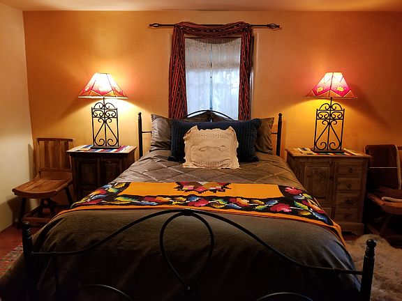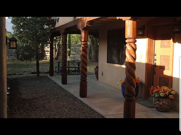 Enjoy this beautiful pueblo style home within walking distance to the Plaza, shops, restaurants and grocery store. Reconstructed in 2006-2007 the house gutted and remodeled. New electric, plumbing, Windows, doors, flooring, kitchen cabinets, New appliances, lighting, New bathrooms, and a fabulous covered portal added to exterior. The exterior was sprayed with insulation, and replastered making the house very efficient with heating and cooling. Town utilities provided and wired with high speed fiberoptics Internet connection. Master bedroom has full bath and laundry accessibility. Second bedroom has ¾ bath. There is a separate dining area and den with fireplace. The covered portal has mountain views to enjoy time outdoors and the property is secluded with a fabulous antique door and stucco wall to gain entry into the compound all with exterior lighting fixtures and sensor lights on all sides of the house. Fully fenced in yard for pets and room on one side of the house for an RV to park. Plenty of parking in front of the house which is also private and off of the street. The property can be perfect for a family or for a vacation home. Proven history of vacation rental income. Big yard for a garden or for building a Casita or studio. Will pay a 3% fee to buyers agent.