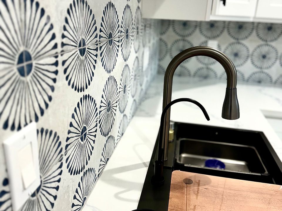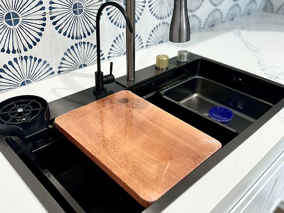 Disfrute de una hermosa cocina con encimeras de cuarzo y un impresionante backplash, creando un espacio elegante y funcional.