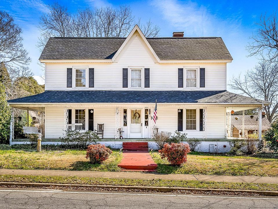 Rare Victorian-style home within walking distance to the charming downtown Fountain Inn, SC! This historical home exudes character with its wrap-around porch, hardwood floors, built-in bookshelves, and high ceilings. The main level features a spacious master suite, two separate living areas, a large dining room with original fireplace, a recently refreshed kitchen, walk-in laundry room, full bathroom, a second full bedroom, and an oversized sunroom. Upstairs you will discover two large additional bedrooms, a second full bathroom, and a bonus room. Newer architectural roof (2016) and upgraded PEX plumbing (2019). The property features a rustic mini log cabin with electricity that used to be located at a former gas station in downtown. It has been said that warm soup was served out of this cabin to comfort the community during the Great Depression. In the spring enjoy beautiful azalea bushes and in the fall pecans from the 5 pecan trees where the homeowner collected over 200 pounds of pecans last year. Also outdoors on the large 0.56-acre lot is an additional storage building with electricity. Zoned for the new Fountain Inn High School, an innovative high school which offers an Institute of Automation and Engineering, full courses of Fine Arts, and AP Courses. Homeowners are offering a $1,500 paint allowance to customize the home to suit your preference. Call to schedule a showing before this unique property is sold!