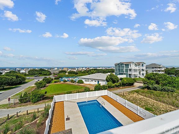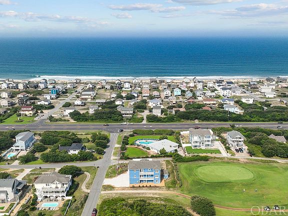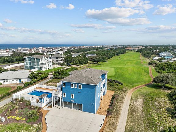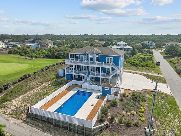 Always wanted to live on a golf course AND have panoramic Ocean AND golf course views? Pack your clubs, 303 Grissom Street in Kitty Hawk is the home for you. This 4,877sf home constructed in 2018 by Stan White Construction sits on a 20000sf lot in an X Flood zone lot and boasts a fenced in 16x38 lit saltwater pool with exquisite Ocean views. Beautifully landscaped and located on the 11th green. Exterior composite decking on all sides, East decks lead to every level of the home. The lower level consists of a spacious area that can be used as a theater room or an entertainment/recreational room fully equipped wet bar, half bath with outside pool entry door. Off this area is the laundry area and 2 large bedrooms with a shared bathroom with tiled walk-in shower. As you approach the second level hallway, there is a walk-in closet with shelving and plenty of storage. Entering the 2nd level, this living space has a half bath. A fully equipped kitchen with subway backsplash and pantry (which was originally done for an alternate private space) for friends or family staying during the holidays. A dining area with bay windows and access to the screened porch with golf course and ocean views and access to East decking. A primary en-suite with extra-large walk-in tile shower with walk in closet and deck access and another primary bonus room with a tiled shower. The third level has a full walk-in closet at entry and as you enter the main living area you have a fully equipped kitchen with a pantry and access to another screened porch off the living area. An en-suite with extra-large walk-in tile shower, a clawfoot tub and a private room with toilet and another primary bonus room with bathroom large tiled shower. Notable features include elevator, 2 gas fireplaces on mid and upper levels, top of the line fixtures, Atlantic Quartz countertops, extra wide trim/molding around doorways, Levolor custom window treatments, LVT flooring throughout with carpeting on all interior steps. Concrete walkway throughout the access areas of carport to the fenced in pool and outside shower area. An 8x24 storage building behind the home for even MORE storage. This home has excellent rental potential as an investment property, a lovely main residence or 2nd home.