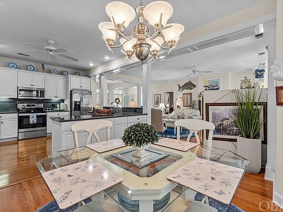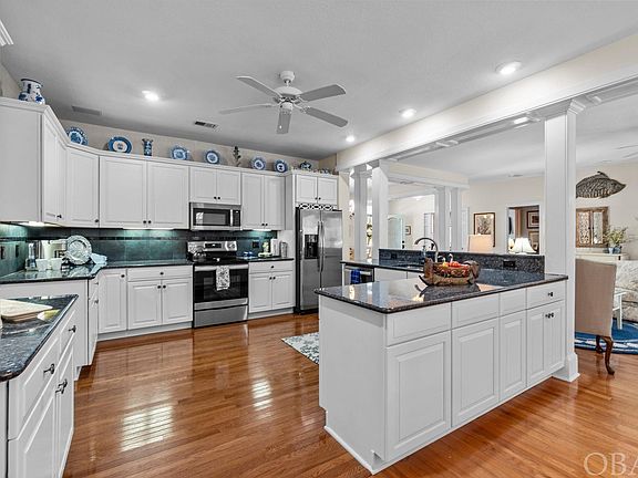 Four Bed four bath gorgeous, meticulously maintained home in the dunes of Southern Shores.  3,437 sq. feet heated living area.  The ground floor is approximately 2,291 square feet and is finished with an abundance of high end trim work, pillars and crown molding.  9 Foot ceilings give it a more spacious open feel.  Bright, open, Remodeled kitchen with stainless appliances and granite counter tops.  Plenty of cabinet space.  Breakfast area with a bay window. Large utility room. Expansive pantry right off the kitchen.  Beautiful hardwood floors throughout most all of the downstairs. Many built-in’s throughout the home!  The living area trim is fantastic. Beautiful gas fireplace with marble surround.  Pillars round out the stunning living area. Large primary bedroom with crown molding with not one but  two large walk-in closets, one on either side of the hallway to the primary bath.  In the gorgeous bath you have two separate vanities each with its own sink divided by a large window taking in the landscaped back yard.  A beautiful glass door tiled shower.  At the other end of the downstairs is the tasteful entrance foyer and a splendid dining room. There is also a library with built in shelves, and pocket door.  Around the corner there are two more spacious bedrooms and two full baths.  X Flood Zone so no flood insurance required.  Mark Martin with Sandmark Construction finished off the upstairs which is about 1,146 square feet heated. The great room in this upstairs is a massive 31 X 28 with oversized ceiling fans to fit proportionally to the size of the room.  Industrial look heat pump vent rounds out the look of the tongue and groove juniper lined super high ceiling. There is also a full bedroom and a full bath.  In addition is a room that could be an office/computer/media room but is not counted as a bedroom.  There are two super HUGE unheated storage areas that could be made into more living area. This area is like having a whole other home upstairs.  There is a mantel that does not convey and will be removed and the four bolt holes repaired. Generac generator with it’s own 320 gallon buried propane tank owned by the seller and conveys with the property.  The is another above ground tank leased through JT Jones for the gas fireplace.  Cost saving separate well for the Irrigation system.  Beautiful natural looking landscaping. New ROOF and heat pumps in 2019.  New water heater in 2016. Andersen windows.  Many have a coating to protect the interior from the sun. There are three hot water heaters. One for each end of the home and one for the kitchen.  Low maintenance vinyl siding. Septic just pumped in 2023.  In the back you have a 31 foot wide Screened porch and a large private deck with roll out sun shade overlooking the landscaped fenced-in back yard.  The lot extends way past the back fence. The lot goes far back from that point and backs up to a small strip of Southern Shores common area.  A massive 26,937 square foot lot.  90 X 292 X 90 X 297. Spacious two car garage with remote openers. Long driveway so you are well back from the road.  Plenty of parking in front of the garage and a convenient turn-around mid driveway. Owner says they have never had water in the garage because the pavement is angled in a way to drain water off to the side of the driveway. Trex style walkway from the driveway to the inviting 27 foot wide front porch.  Carolina blue vinyl on the ceiling of the front porch. Look in associated docs for Aerial Photo, County Permits and Surveys, Expenses, MOG/RPD, House Sketch, Virtual Tour, Southern Shores Realty Disclosure etc. For a low $70 per year the Southern Shores Civic Association lets you take advantage of three sound side marinas with picnic and crabbing areas, Private Sound Beach, thirty-four Private Ocean Beach accesses, parks, basketball and soccer fields. For an additional fee you can join the SSCA tennis courts.  Appointment only.  Very EZ to show.