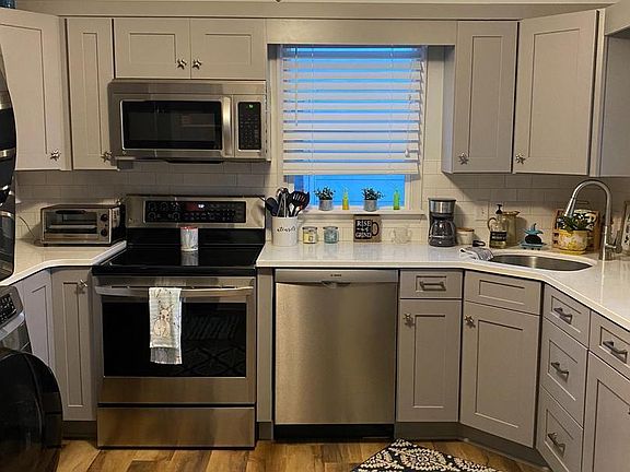 Bi-level deckNew kitchenOverlooking the waterQuartz countertopsStainless appliancesDeep bowl sink