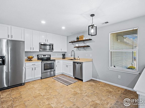Don't miss this cute end unit condo in the heart of Erie! Located right across the street from a wonderful neighborhood park and adjacent to the Coal Creek trail, this three bedroom property is an amazing value. Enjoy beautiful mountain views from the charming front porch and the primary bedroom. You'll love the handy built-in "drop spot" just inside the entry. The eat-in kitchen is light and bright with cheerful white cabinets, open shelving, and a large pantry. Step into the spacious adjoining open living and dining area that's perfect for entertaining! You'll love the convenience of vinyl plank flooring throughout the main level and the brand new carpet up the stairs and throughout the upper level. You'll enjoy parking in the garage on those snowy Colorado days. A crawl space provides extra storage. The fenced side and back yard offer a great place to garden or relax. This property is in an ideal location with stores, coffee shops, restaurants, schools and other amenities in close proximity. This home is move-in ready and waiting for your personal touches!