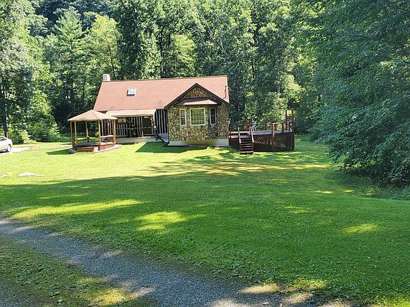 Own your own 2 acres of private paradise! Welcome to 303 Mosquito Road. This charming 3 bedroom, 3.5 bath Log Home even has public water and sewer. Want to cool or do some fishing? Head out back and take a dip or drop a line in Mosquito Creek! Enjoy summer family get-togethers under the pavilion and around the fire pit or on one of the 3 decks. Plus, there's plenty of room for your "toys" in the detached 24'x30' garage.There are also 3 heating options for this home: electric baseboard, a pellet stove, and a wood/coal furnace (in the basement). The spacious master bathroom has sliding glass doors that open to the deck and an ensuite with a jetted tub. The 3rd bedroom and bath are in the walk out lower level which also has a hobby or exercise room. Don't let this one get away! Call the listing agent for details!