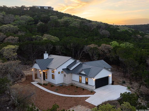 Nestled in the tranquil hills of Mico, Texas, this stunning custom home rests on 3.04 acres within the sought-after gated community of Dancing Bear Ranch-offering the perfect blend of privacy, elegance, and lifestyle. Step inside to discover stained concrete floors, rich custom paint tones, and designer light fixtures that reflect a curated sense of style. The expansive living area features an eye-catching fireplace with intricate tilework, creating a warm and sophisticated gathering space. The chef's kitchen is a true showpiece-boasting a striking "leather" granite island, granite countertops in all bathrooms, a professional-grade 6-burner KitchenAid gas stove, double ovens, a farmhouse sink, soft-close cabinetry, and custom faucets throughout. It's the ideal setting for both refined entertaining and everyday comfort. The primary suite offers a serene escape, with a luxurious shower featuring floor-to-ceiling tilework, a built-in bench, and spa-inspired finishes. A Jack & Jill bathroom connects the secondary bedrooms with both convenience and style, while a dedicated mud room enhances daily functionality. Enjoy thoughtful upgrades throughout, including a durable metal roof, an oversized custom ceiling fan, and expansive windows that frame the natural beauty of the surrounding acreage. As a resident of Dancing Bear Ranch, you'll also enjoy access to a suite of premium amenities: a resort-style pool, private access to Medina Lake, a scenic clubhouse and pavilion, a basketball court, and a dedicated children's play area-all just moments from your doorstep. This is a refined Hill Country retreat where luxury meets lifestyle. Just a short drive from San Antonio, yet a world away in peace and beauty. Schedule your private showing today and experience the exceptional.