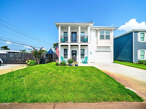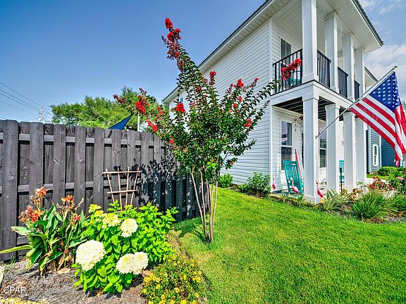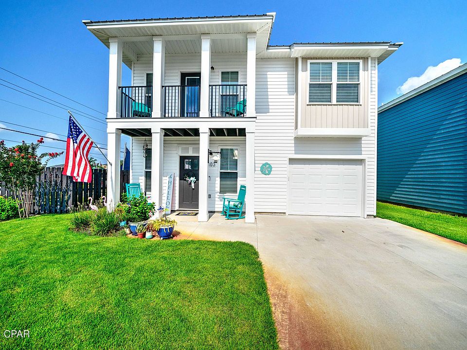 Come see and be captivated by this craftsman style home located in Callaway Corners close to Tyndall AFB. It is situated on an oversized lot (two lots utilized as one) that creates extra parking, an extended side yard and patio area used for entertaining or simply enjoying sitting outside under the sun sail which provides plenty of shade. There is also a shed/workshop with power. Step inside and fall in love with its open floor plan, 4 bedrooms, 2.5 baths, and 9ft. ceilings. The kitchen boasts a large island with quartz counter tops and a walk-in pantry. Slip upstairs to one of four bedrooms (carpeted) and enjoy the fresh air while stepping out on the balcony just off the master suite. This home has a security system, SMART door locks, and a SMART garage door opener. There is a metal roof and the sprinkler system is on a shallow water well which provides nutrients essential to the lawn and flowers. The HOA provides a playground including a swing set, slide, and playhouse, plus a half basketball court.