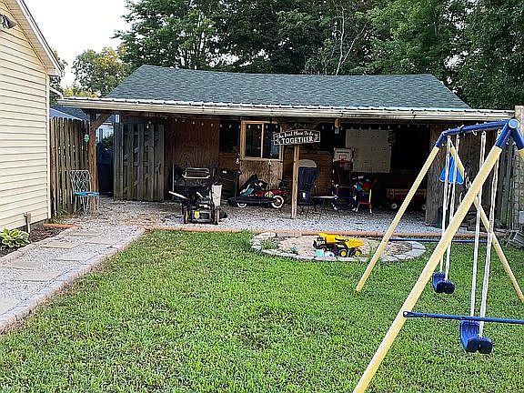 Overhang in the back perfect to keep a lawn mower & kids toys out of the weather.
