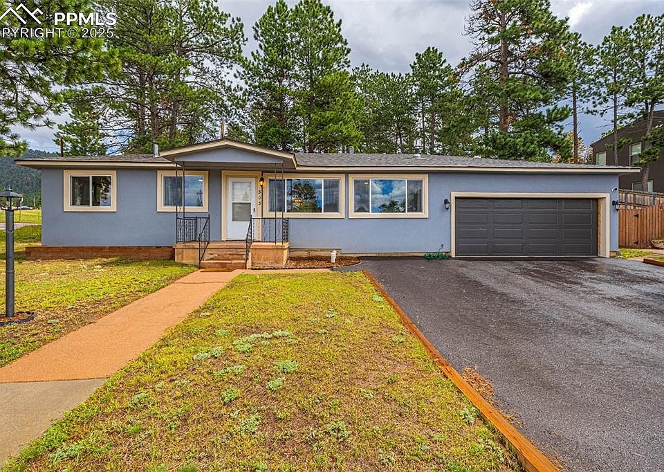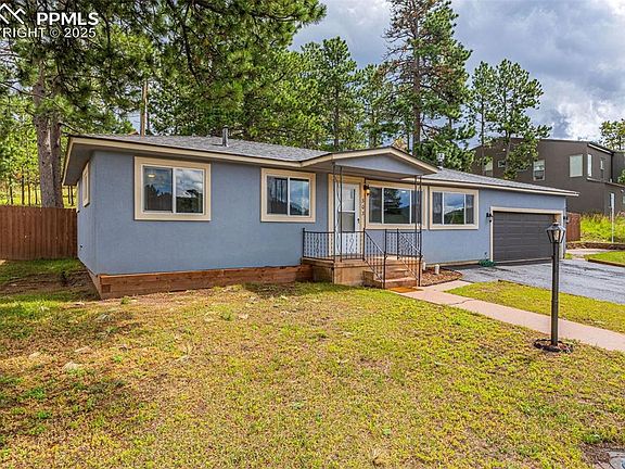 This adorable 2-bedroom, 1-bath home sits on a massive .44-acre fenced lot, offering both space and privacy—right in the heart of town! Enjoy the convenience of being within walking distance to all that Woodland Park has to offer, from shops and dining to local trails and events. Inside, the spacious living room welcomes you with brand new carpet, a charming gas stove, adding warmth and ambiance on cool mountain evenings. The tastefully updated kitchen features custom shelving, stainless steel appliances, and modern finishes, while the stylish bathroom remodel carries the same thoughtful design. The primary bedroom boasts brand new carpet, a versatile closet with built-in shelving and laundry hookups, making everyday living a breeze. Additionally, the secondary bedroom also features brand new carpet. An attached 2-car garage and ample parking add extra convenience. Zoned Community Commercial, this property opens the door to short-term rental potential or other creative uses, adding even more value and opportunity.