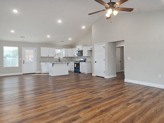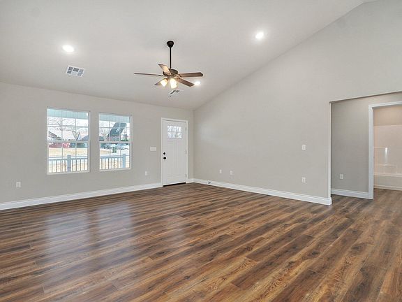 Explore contemporary living in this brand-new home featuring an open floor plan with stylish plank flooring in the living areas and cozy carpeting in the bedrooms. Boasting nearly 1400 square feet, this home has a split floor plan with 3 bedrooms and 2 bathrooms, including a spacious walk-in closet in the primary bedroom. The kitchen showcases an island and pantry, complemented by LED recessed lighting and inviting vaulted ceilings throughout. Enjoy leisurely moments on the covered back patio. This quality-built home, complete with a side-entry 2-car garage, is a must-see for those seeking a new standard of living.