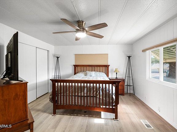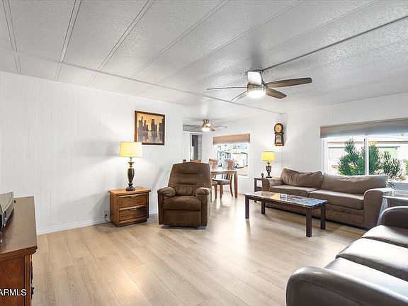 A Charming move in ready 2 bedroom/2 bath in a gated 55+ Active Adult community! This double wide features an updated kitchen, new appliances, new floors throughout the home and MUCH MORE!! This lovely corner lot has an abundance of natural light beaming through new low energy windows. The outside of this home has been well taken care of and comes with two large sheds for storage as well as a screened Arizona room. Enjoy various community amenities such as an all year round heated pool and spa, fitness center, community laundry, billiard room, bocce ball and many activities!