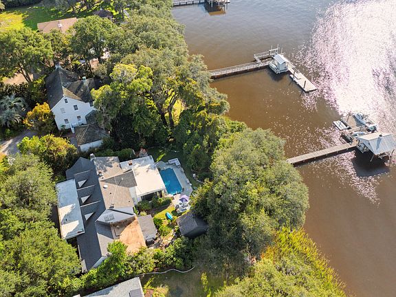 Watch the most incredible sunsets from one of the highest waterfront bluffs in the local Charleston area (+15ft). This deepwater opportunity is just minutes from the city, nestled among grand live oaks and other fine homes along the desirable Stono River waterfront.This comfortable masonry home was one of the first to be built (1947) in the bucolic Riverland Terrace neighborhood. where quiet oak-lined streets mingle with charming modern and mid-century architecture. Finish the day lounging around the heated inground saltwater pool while enjoying the best unobstructed ''long'' views of the Stono and Intracoastal Waterway.The home was sited and built to capture the dramatic sunsets.The lush garden is a delight, offering privacy from the street with its graceful brick circular drive and pathways leading to the stone patio terrace for outdoor dining around the fireplace. Styled as a two-story Colonial, the floorplan features spacious formal rooms and a full-width glass family room to the rear taking advantage of the view. Currently used as a 3 bedroom + walk-in dressing room, this 4b bedroom home with its attached 2-car garage allows for future expansion and flexibility under roof if needed. A short walk down the bluff to the dock certainly rounds out this package, complete with a covered pierhead, lift and spacious floater. In addition, by the pool you will enjoy the studio/cottage, perfect for remote work, or just an afternoon nap.