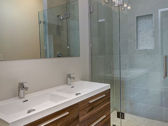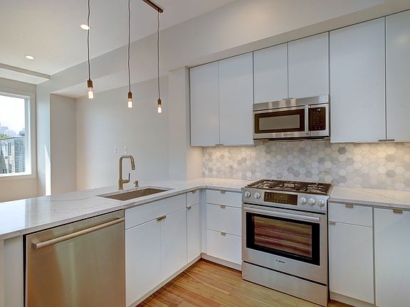 303 Sumner Street Condominiums offer sophisticated, new construction two bedroom, two bath residences in the heart of Jeffries Point. Modern design pairs clean lines with walnut and marble finishes creating unique homes just 1.5 blocks from Maverick Sq that urbane city dwellers are sure to adore. Unit 3R includes a spacious floor plan which incorporates two generous bedrooms with walk-in closets, two full baths, a grand open concept kitchen, living, dining featuring a large kitchen island, 9’10” ceilings, private decks and walk-up roof deck with incredible panoramic views. High end finishes include Calacatta quartz countertops, 3” marble hexagon backsplash, Bosch stainless appliance package including slide-in gas range, vented range hood & drawer microwave. Wide plank, matte walnut flooring and recessed lighting throughout the condo. Master bath features floating double vanity, Carrara Venato marble herringbone flooring, marble tiled walk-in shower.