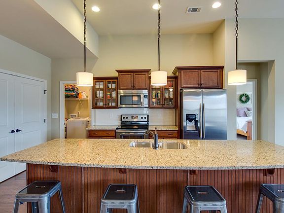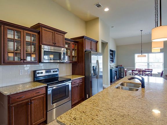 Open Floor Plan w 11ft Ceilings, Kitchen w 10 ft island/Glass Door inserts, Huge Pantry, Master + 2 Down,Teen Suite & Bonus Up !Glowing Hardwoods,Stone Fireplace!Huge Covered Porch w Ceiling Fan! Backs up to common area/walking trails/playground.