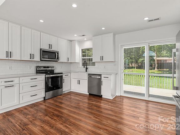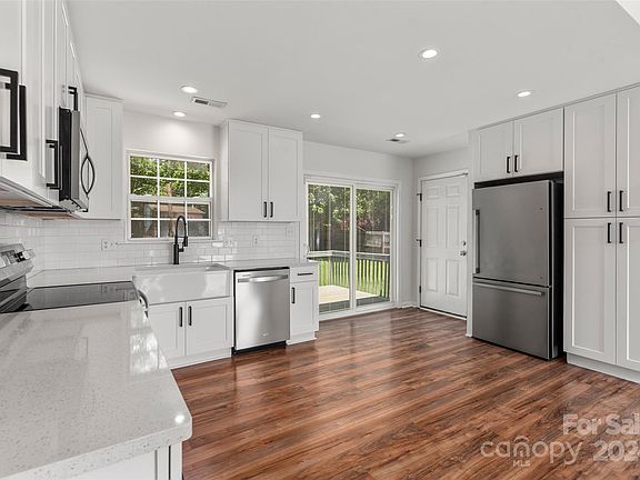 This beautifully designed 3-bedroom, 2-bathroom residence features a bright and airy floor plan adorned with plenty of windows, filling the space with natural light and warmth. The fully updated kitchen is a chef's delight, featuring elegant quartz countertops, a farmhouse sink, and sleek stainless steel appliances that combine functionality with modern style. Outside, discover a large, fenced and partially wooded backyard with ample room for expansion or the addition of a pool. It's an ideal setting for outdoor activities, offering plenty of space for play and pets to roam freely. There is even an RV electrical hook up to be used when guests come to visit! Located just moments away from the 74 bypass, 485, and a new hospital, this property offers great accessibility. Enjoy the ease of quick trips to nearby shops and restaurants. Don't miss out on this rare opportunity to own a home that combines contemporary living with a desirable location.