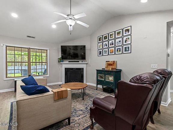 Welcome to your own private retreat in the heart of the Crimson Faire community! This charming 3-bedroom, 2-bathroom home is nestled on a generous 1.28-acre lot, offering the perfect blend of comfort, functionality, and creativity. Enjoy peaceful mornings and relaxing evenings on the covered front porch, where you can take in the beauty of Eastern North Carolina's seasons. Step inside to an inviting open-concept floor plan with vaulted ceilings in the living room and seamless flow into the kitchen and dining area—ideal for everyday living and entertaining. The kitchen was fully renovated in 2025 and is a true showstopper featuring custom-made maple cabinetry, luxurious quartz countertops, all new appliances, a beautiful stainless steel wall-mounted canopy range hood, and stylish floating shelving that adds both function and flair. You'll also appreciate the spacious pantry, eat-in dining area, and convenient laundry closet located just off the garage entry. Throughout the home, you'll find stylish and low-maintenance LVP flooring, making cleanup a breeze while adding a modern touch. The guest bedrooms and bathroom have also been refreshed with new paint and LVP flooring in the bedrooms, and an updated vanity in the guest bathroom that complements the look and feel of the rest of the home. The tranquil master suite is a true retreat with fresh designer paint, LVP flooring, and a custom-built closet system designed with storage and organization in mind. Step outside to a private covered patio and enjoy the peace and privacy of your fully fenced backyard. But the real gem? A unique and thoughtfully designed private wooded trail system tucked into your back acre—complete with a tiny footbridge, gravel paths, and rustic log borders. It's a creative and rare feature, especially in a neighborhood setting! Additional upgrades include a new architectural shingle roof (2023) and extra attic storage above the garage with pull-down ladder access. This home is one-of-a-kindupdated, well-maintained, and full of personality both inside and out. Don't miss the chance to make it yours!