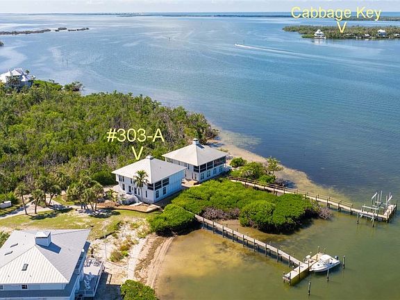 Just beyond the living room, the screened balcony overlooks a protected basin and shared dock. The property includes a one-third ownership interest in the dock, granting use of a boat slip—an exceptional amenity for island living. The dock sits just off the Intracoastal Waterway, with Cabbage Key less than a half-mile to the south. Cayo Costa State Park, renowned for its 7.5 miles of pristine Gulf beaches, is a short boat ride away via either Captiva Pass or Boca Grande Pass, both within four miles.