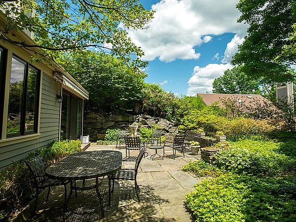 Exceptional, meticulously renovated ''E'' unit on level, beautifully landscaped property with stone terrace, old stone walls and great privacy. Inviting entrance hall with open stairway leads to sunny, east facing living room with fireplace, and a cozy library with built-ins and great light. The dining room with a fireplace and sliding doors to the private terrace, is adjacent to the fabulous new kitchen with center island, desk and convenient laundry. First floor master suite with generous closets and new bathroom, plus a large bedroom with two exposures and a lovely hall bath. Upstairs is a bedroom and bathroom and a handsome office (could be a fourth bedroom), as well as a bright, windowed and skylit space for reading or exercise.Amazing closets and storage, plus a two car garage.