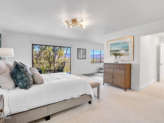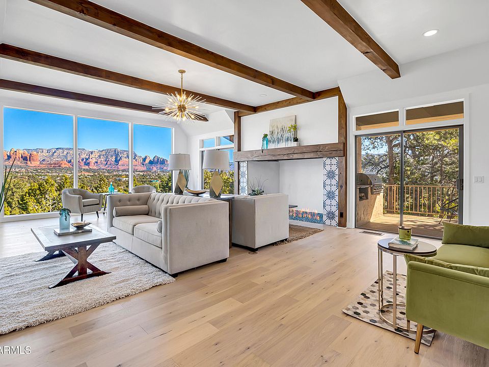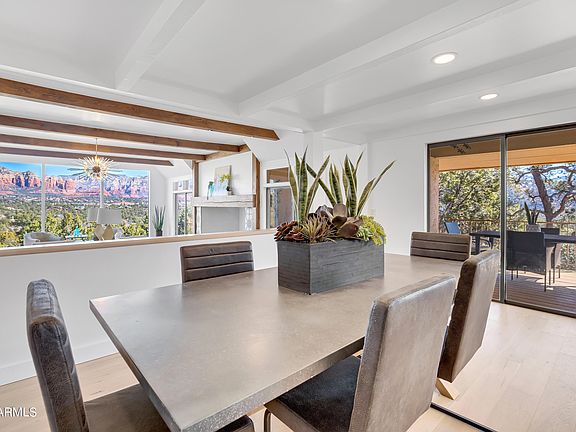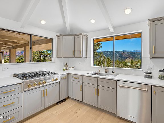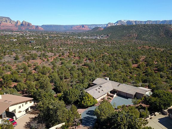 Contemporary Tranquil Respite beautifully remodeled in 2023 & BACKS TO NATIONAL FOREST. Private cul de sac location OFFERING PANORAMIC RED ROCK VIEWS & 4 CAR Garage (OR 3 Car + RV Garage). Marvel at Iconic Red Rock formations & Mogollon Rim through floor-to-ceiling glass windows and glass sliders in the living room, dining room, kitchen & three large viewing decks. New Roof, two new Ruud A/C units, new duct work, whole house air filtration system & SO MUCH MORE!! Entertainers' Dream LR boasts 10 ft ceilings & massive Mediterranean fireplace w/ high heat plaster and Blue fire glass. Multiple VIEW decks & patios to Stargaze. .79 ACRE lot provides Plenty of room to add a pool, raised gardens & a hot tub. LARGE & OPEN Chef's Kitchen features a 6-burner ZLine gas stove, prep island/breakfast bar w/ Zline pull-out microwave, Kitchen-Aid Convection Oven & Dishwasher, oversized SS farmhouse sink w/ ledge for portable drain pan & Ruvati solid wood cutting board. Plenty of Shaker Cabinets for storage & lighted pantry too! Step Outside for outdoor grilling on SS Bull gas grill.