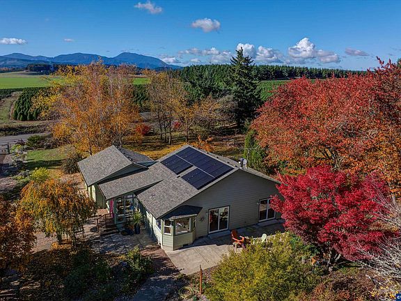 Come home to your own private oasis! Stunning 5 acre property w/ views of Marys Peak and a single-level, 2 bed + office home PLUS a 2,304SF art studio/shop, both w/ solar panels! Main home features an open concept floorplan w/ vaulted ceiling, cozy woodstove, primary suite, sunporch/mudroom. Shop has 36x30 open space, 16x34 art studio w/ bath, additional garage w/ oil pit, & 1,000SF of storage underneath. Must see private patios, multiple orchards, garden beds, greenhouse, perennials...Tranquility awaits!